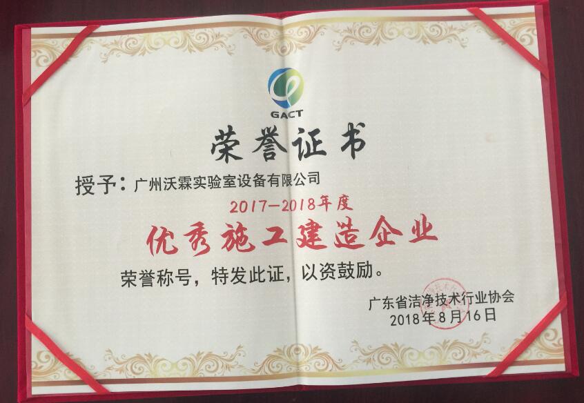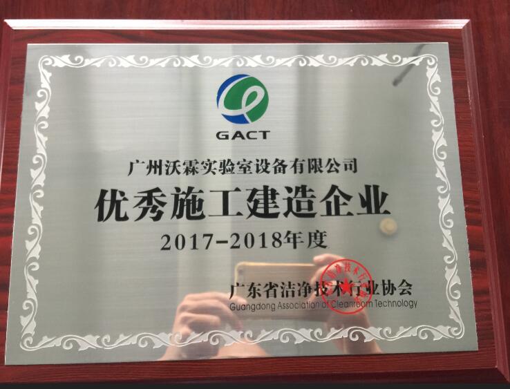 熱烈祝賀廣州沃霖實(shí)驗(yàn)室設(shè)備有限公司獲得廣東省潔凈技術(shù)行業(yè)協(xié)會(huì)2017-2018年優(yōu)秀施工建造企業(yè)